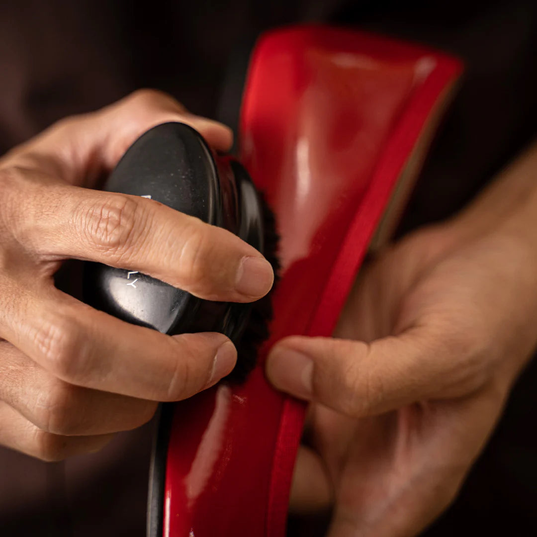最初にブラッシング行い、土や砂などの汚れを落とします。豚毛ブラシでも良いですが、なるべき傷がつかない様にするためには、柔らかい毛質の馬毛ブラシをお使いください。